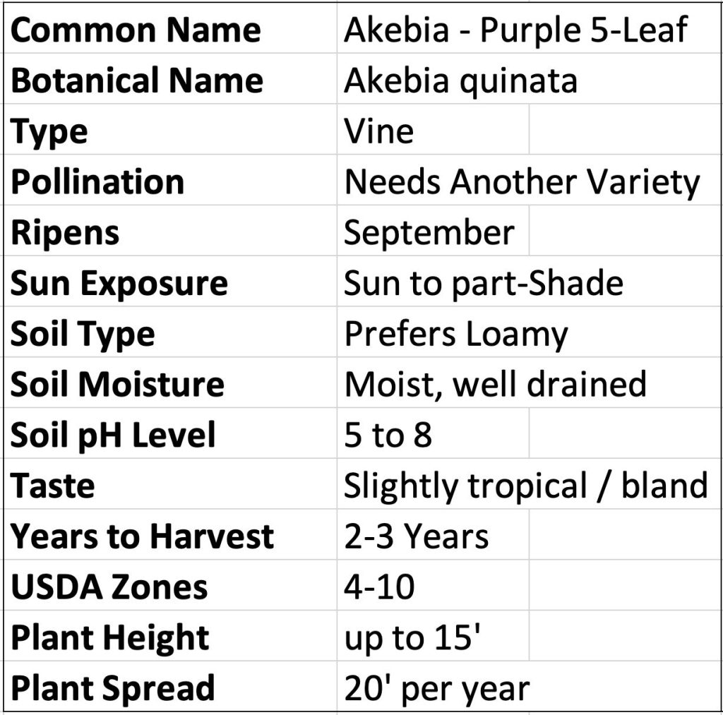 Akebia Purple 5-Leaf grows best in sandy or loamy soil, but will grow in heavy clay. It likes moist but well drained soil and prefers full sun but can handle a fair amount of shade.