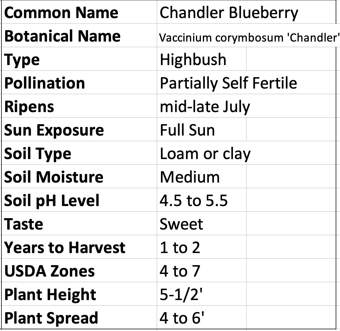 Chandler blueberry is a highbush type cultivar. Plants will grow to a mature height of 5 ½ feet. The bush is upright spreading slightly. The plants will tolerate high moisture and heavier soils than other highbush varieties.