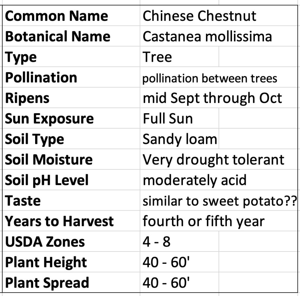 Chinese Chestnut does require cross pollination, so you will want to plant others close by. The trees can start to produce nuts as early as the fourth year and ripens mid-September through October. Usually there are three nuts encased in a prickly husk that opens when the seeds are ripe. The nuts are large and sweet, though not as sweet as an American Chestnut.