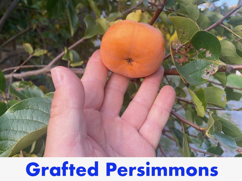 Improved grafted persimmons are grafted on the American persimmon root stock, but the top (known as SCION) could be either improved American variety or improved Asian variety. We use American Persimmon rootstock because it is native and perfectly suited to handle our environment. We use improved tops, SCION wood, for larger and tastier fruit.