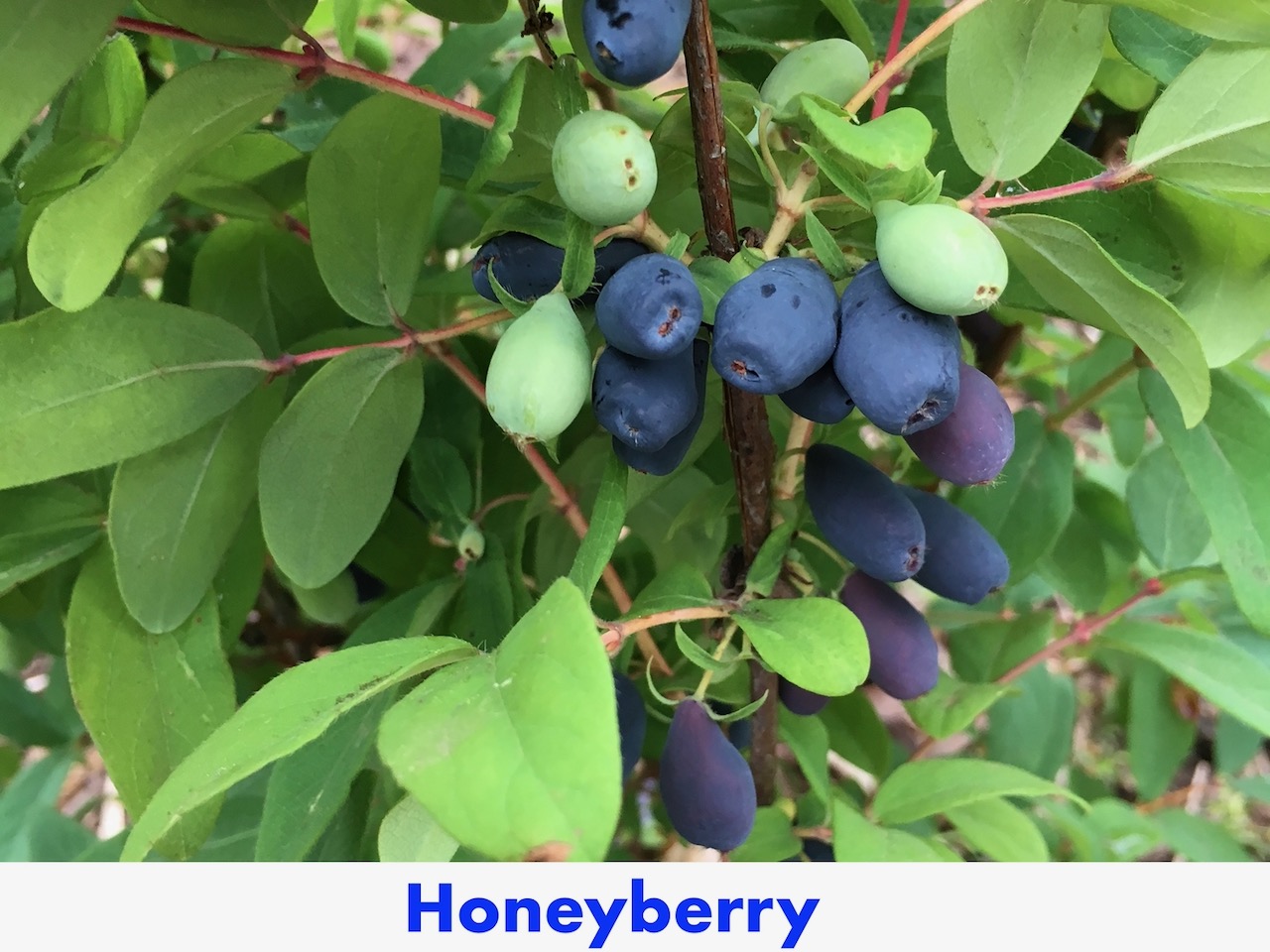 Honeyberry is actually a member of the honeysuckle family. It has several other names like Haskaps and edible blue honeysuckle. This noninvasive member of the honeysuckle family produces clusters of unique, elongated berries with a high level of antioxidants and a sweet-tart blueberry flavor that is good for fresh eating or making preserves. It is a bush that grows from 3 to 6 foot depending on variety.