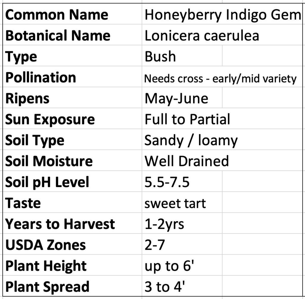 is an early to mid-season blooming variety that has blue tear drop shaped fruit that tastes similar to blueberries. Indigo Gem is an early to mid-season bloom and needs another early to mid-season bloomer to crosspollinate. It has a medium-small size sweet-tart to tart tasting fruit and grows to 6-foot high.