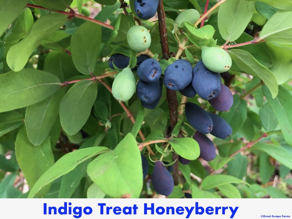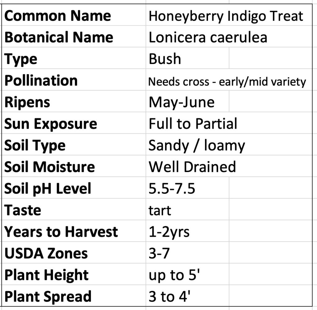 Indigo Treat Honeyberry Lonicera caerulea is an early to mid-season blooming variety that has blue tear drop shaped fruit that tastes similar to blueberries. Indigo Treat is an early to mid-season bloom and needs another early to mid-season bloomer to crosspollinate. It has a medium size, tart tasting fruit and grows to 5-foot high.