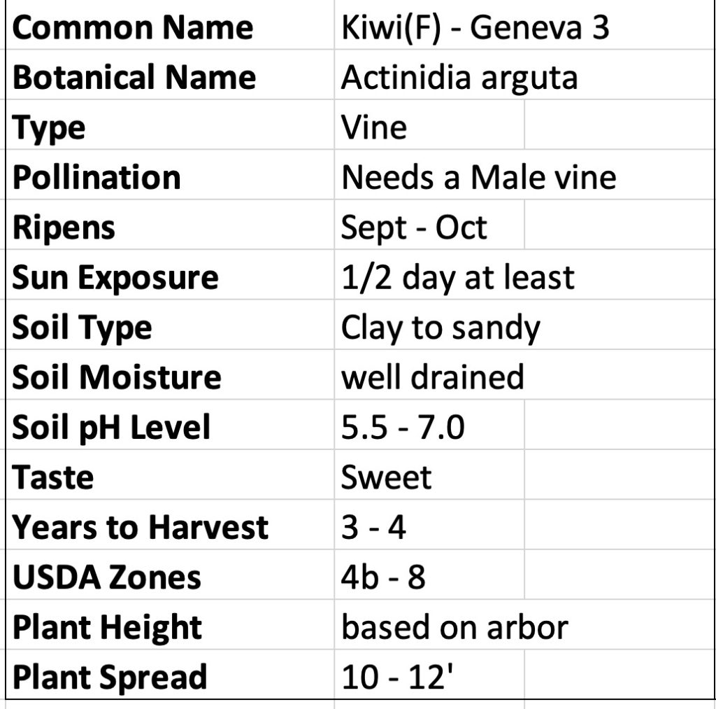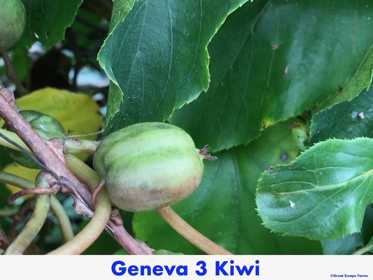 Sorry we do not ship. Kiwiberries Geneva3 Actinidia arguta is a female variety of this perennial hardy kiwi vine which produces grape-sized berries with an intense tropical taste that do not require peeling. Geneva 3 is a highly productive and flavorful kiwiberry variety. ‘Geneva 3’ is the best-performing selection of the ‘Geneva’ series. The medium sized round fruits, olive green with a subdued blush, grow in dense clusters and exhibit exceptional storability.