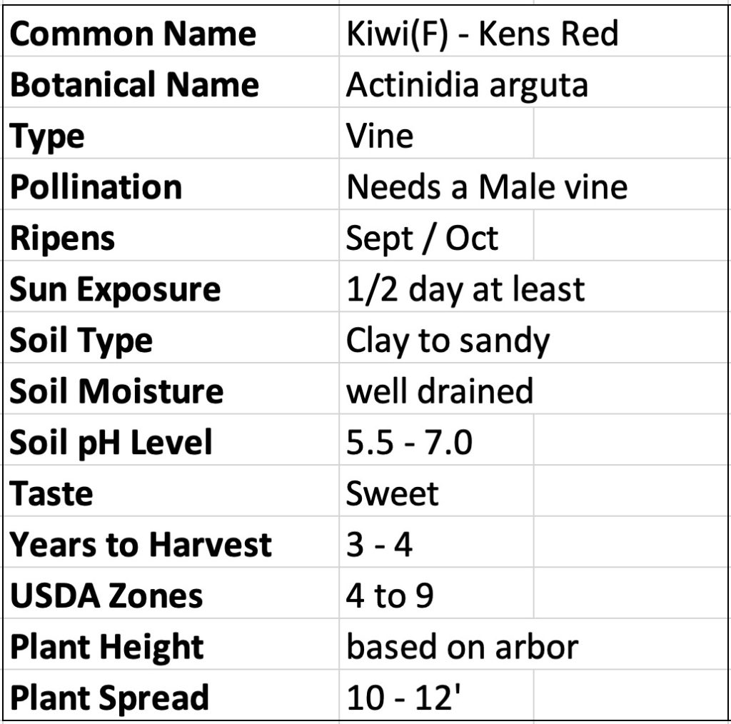 Sold Out. Sorry we do not ship. Kiwiberries Kens Red Actinidia arguta is a female variety of this perennial hardy kiwi vine which produces grape-sized berries with an intense tropical taste that do not require peeling. In 3 to 4 years of planting you will get a kiwi with sweet tasting fruit that is a reddish purple in color and yielding up to 100 pounds. Kens Red flowers in May and the fruit is ready for picking in September / October timeframe.
