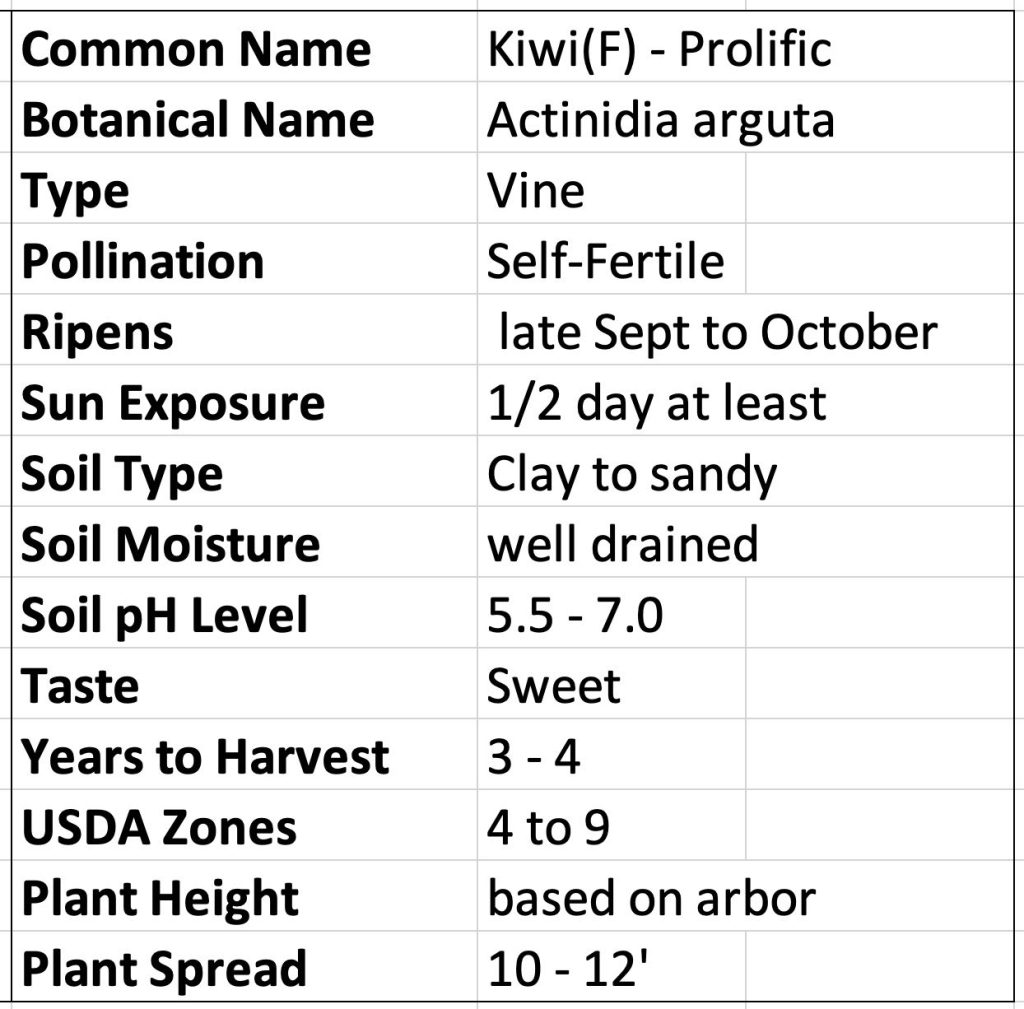 Sorry we do not ship. Prolific Kiwi Berry Actinidia arguta is a female variety of this perennial hardy kiwi vine which produces grape-sized berries with an intense tropical taste that do not require peeling.
