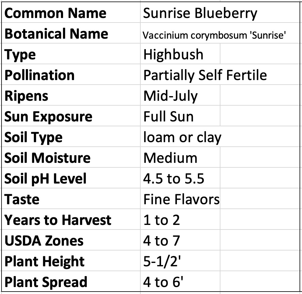 Sunrise blueberry is a highbush type cultivar. Plants will grow to a mature height of 5 ½ feet. The bush is upright spreading slightly. The plants will tolerate high moisture and heavier soils than other highbush varieties.